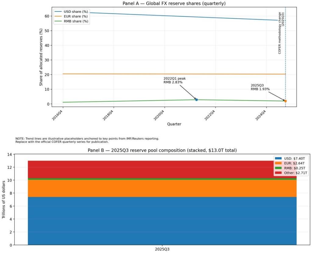 The renminbi’s global reserve share fell from a 2.83% peak in early 2022 to 1.93% by 2025’s third quarter.